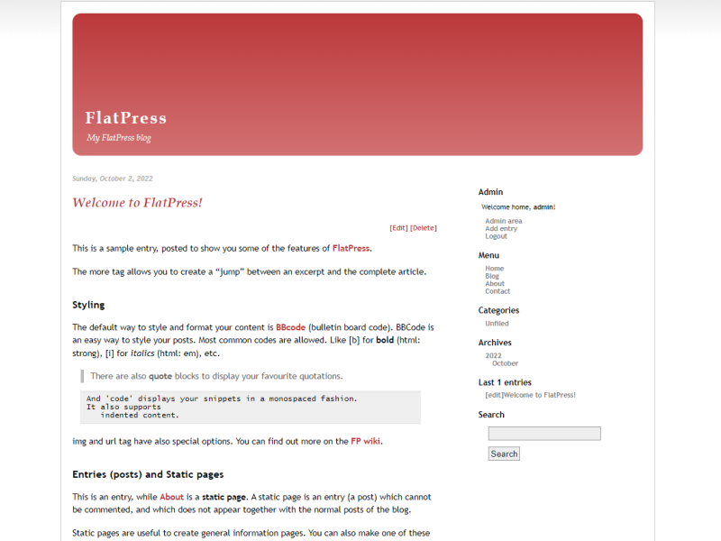 Statische Seiten sind sinvoll für generelle Informationen, zum Beispiel eine feste Startseite oder das Impressum. Man könnte sogar komplett auf die Blog-Funktionen verzichten und mit FlatPress eine Website mit ausschließlich statischen Seiten erstellen.